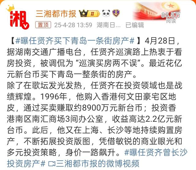 4月28日,有媒体报道,任贤齐最近在青岛准备巡回演唱会时,顺便花了一个亿的台币在青岛买下了一条街的房产做为投资。